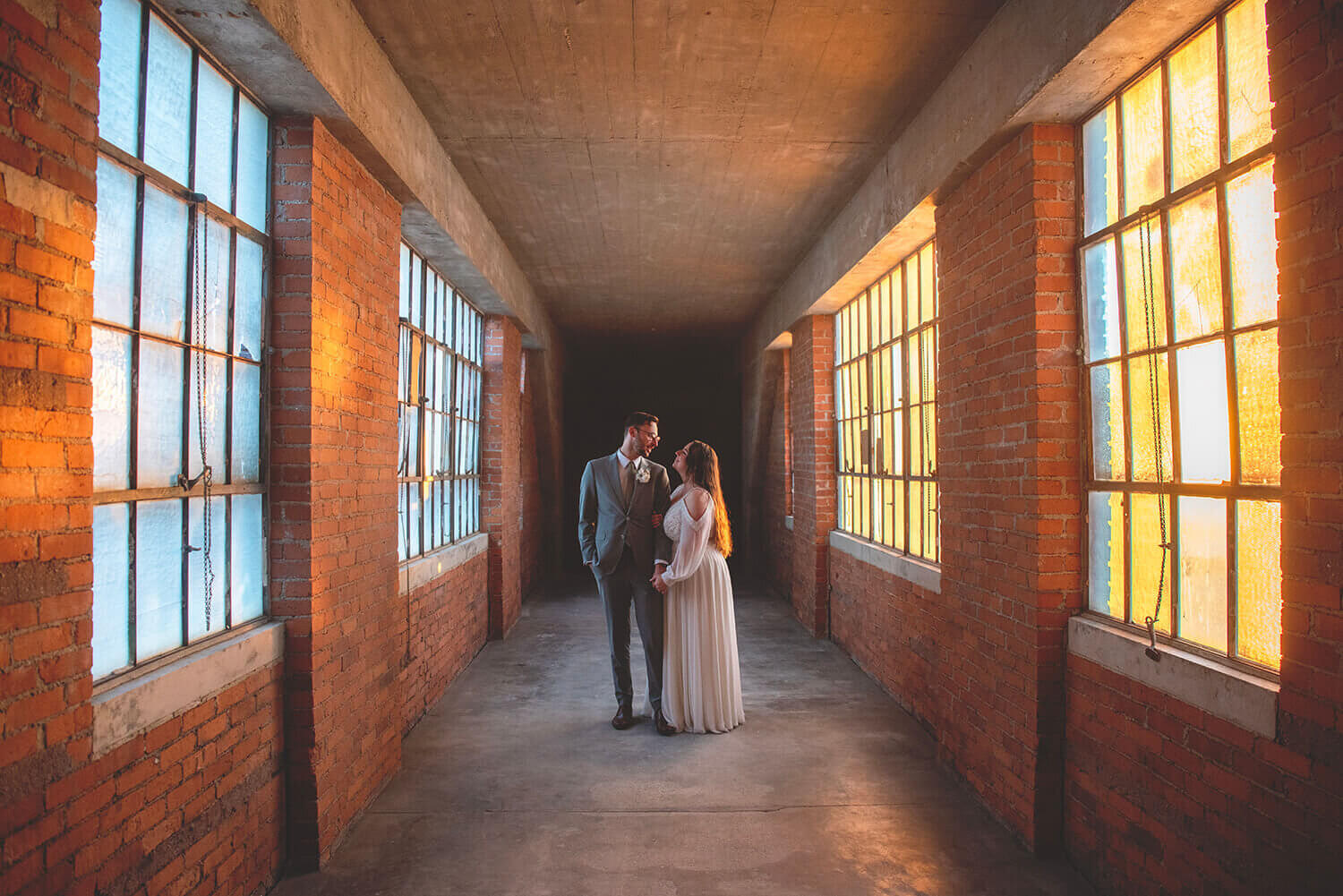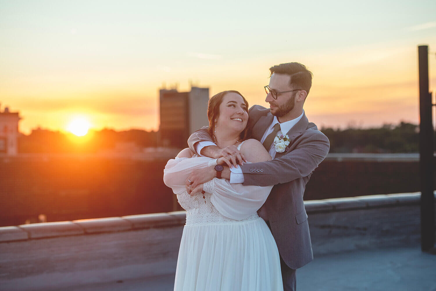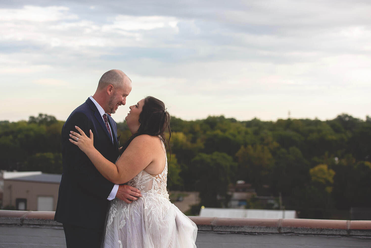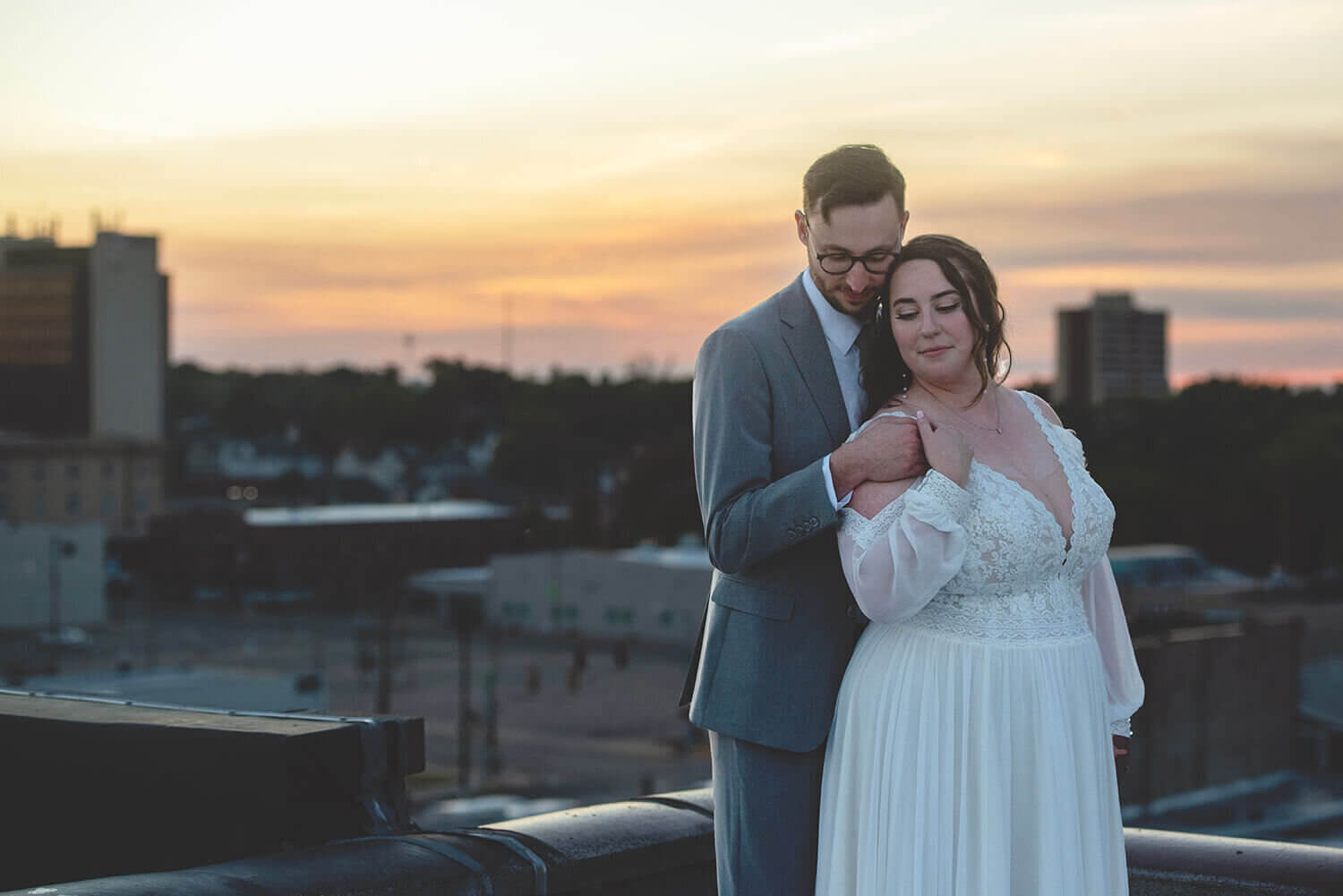 What I love the most about wedding photography at Grand River Hall is the roof. I mean, come on. It’s pretty incredible. While it is sometimes difficult for full bridal party portraits in the middle of the day (with wind and direct sunlight), it is absolutely the best place to be at golden hour and sunset with the bride and groom. Amazing views, city vibes, and what can be a gorgeous sunset is magic here. I also lowkey love the alley across the way and the busted windows on the factory next door.